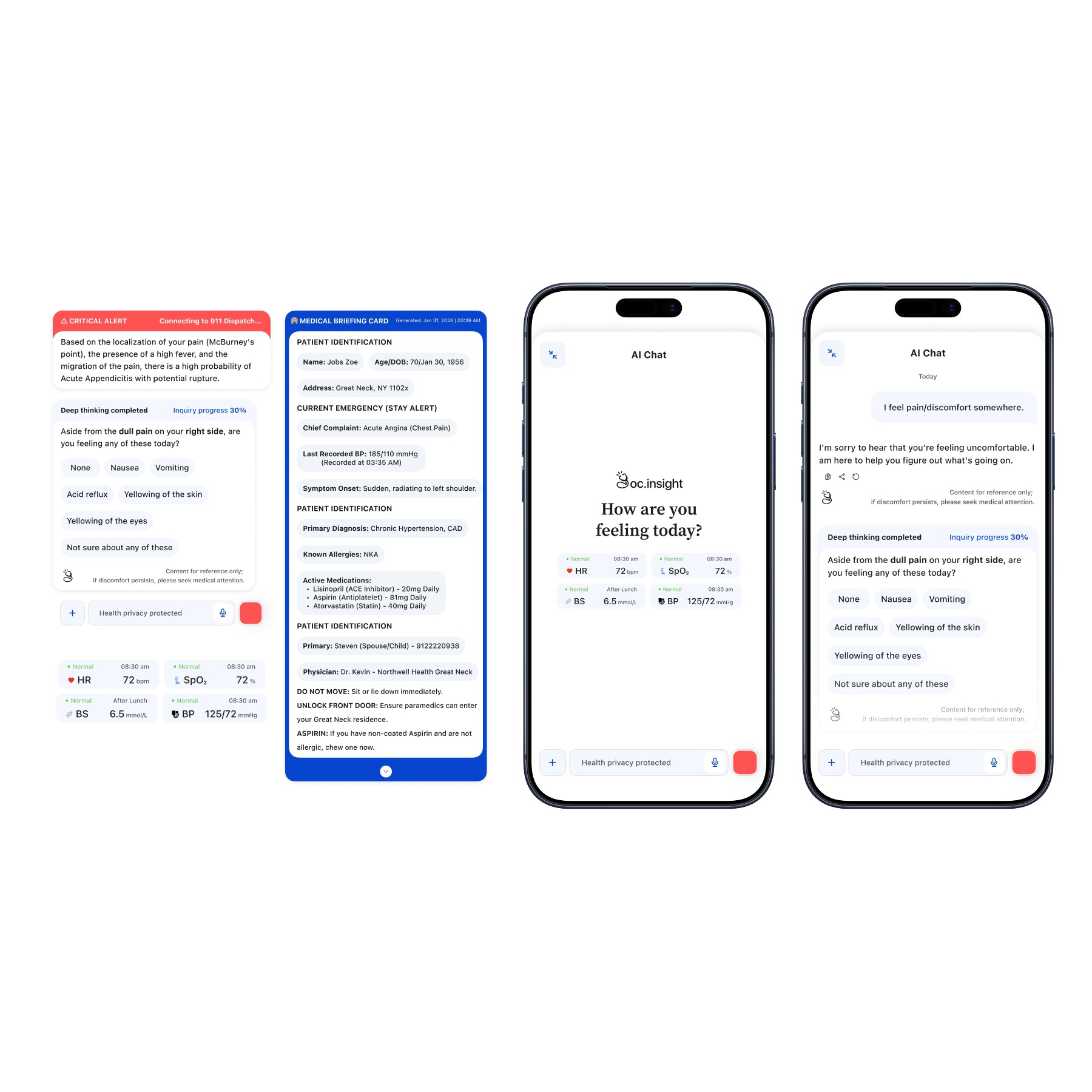 Intelligent Response: Based on a real-time Severity Assessment, the AI dynamically triggers one of four tailored pathways: Critical: SOS Emergency + Briefing Card, Moderate: Doctor Booking + Reminders, Mild: Self-Care + Active Check-ins, and Normal: Preventive Tips + Reassurance.